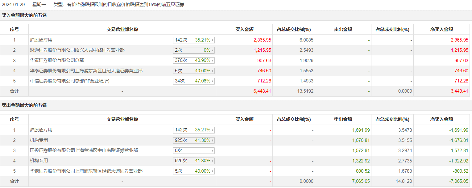 九联科技1月29日跌15.9%,全天换手率达15.86%,振幅达16.76%。龙虎榜数据显示,营业部席位合计净卖出616.64万元。其中,机构合计净卖出2999.73万元。此外,沪股通专用、国投证券上海黄浦区中山南路证券营业部分别卖出1691.99万元、1572.81万元;沪股通专用、财通证券绍兴人民中路证券营业部分别买入2865.95万元、1215.95万元。