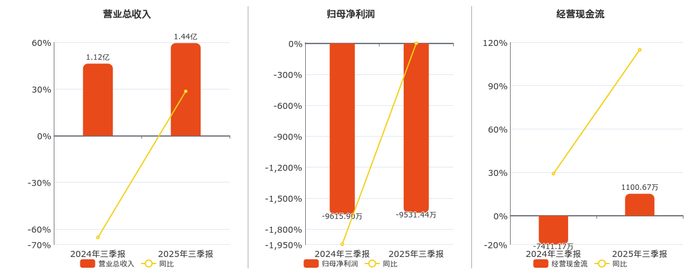 公司营业总收入为1.44亿元。归母净利润为-9531.44万元。经营活动现金净流入为1100.67万元。