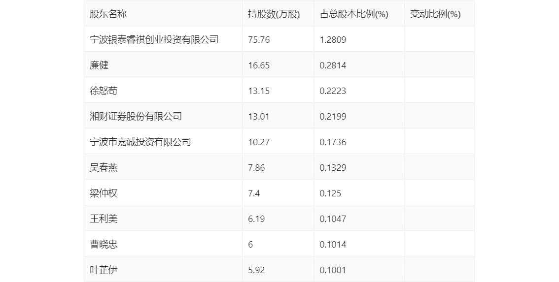 一季报显示,2024年一季度末公司十大流通股东中,新进股东为廉健、宁波市嘉诚投资有限公司、王利美、叶芷伊,取代了上年末的朱泽、北京嘉华宝通咨询有限公司、高云岚、淳厚信睿核心精选混合型证券投资基金。在具体持股比例上,宁波银泰睿祺创业投资有限公司、徐怒苟、湘财证券股份有限公司持股有所上升,曹晓忠持股有所下降。