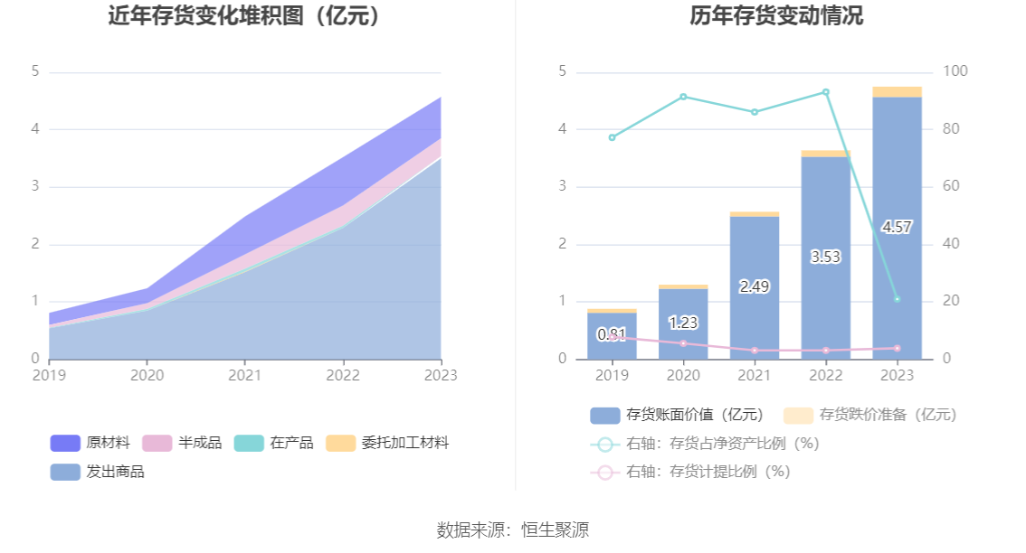 从存货变动来看,截至2023年年末,公司存货账面价值为4.57亿元,占净资产的20.99%,较上年末增加1.05亿元。其中,存货跌价准备为1832.02万元,计提比例为3.85%。