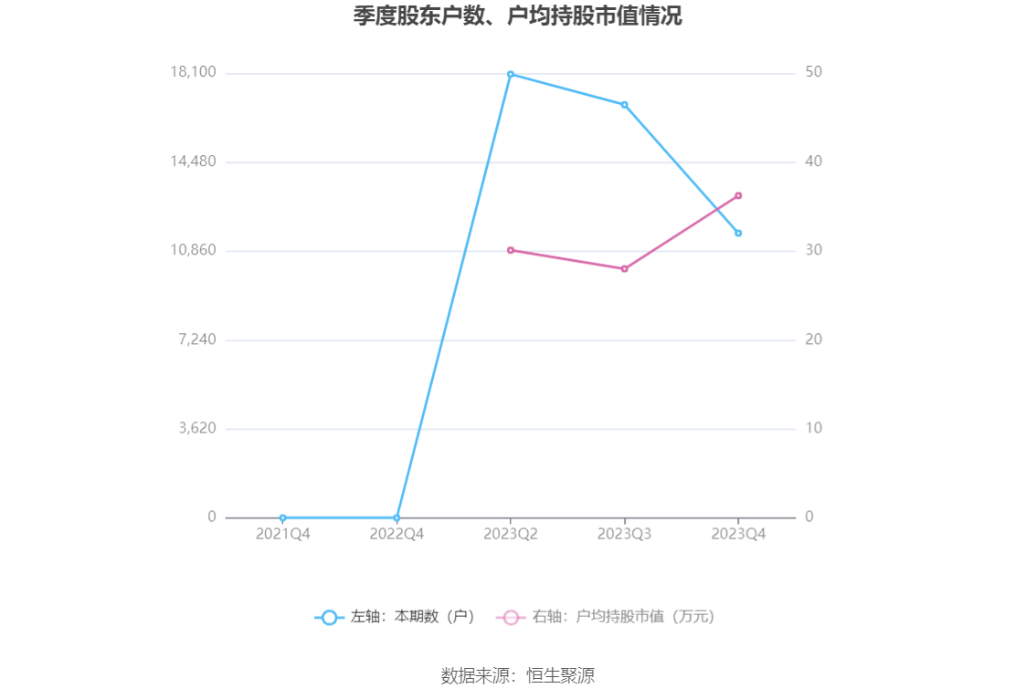 筹码集中度方面,截至2023年年末,公司股东总户数为1.16万户,较三季度末下降了5227户,降幅31.09%;户均持股市值由三季度末的28.00万元上升至36.23万元,增幅为29.39%。