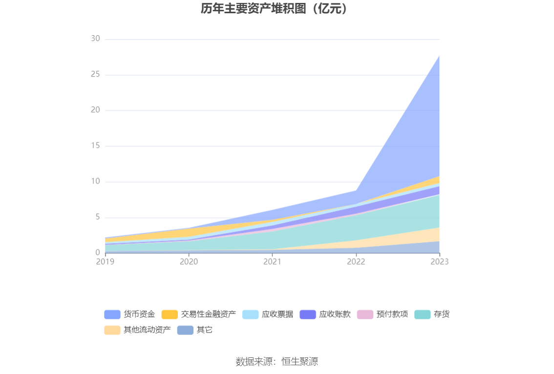 资产重大变化方面,截至2023年年末,公司货币资金较上年末增加798.22%,占公司总资产比重上升39.59个百分点;存货较上年末增加29.65%,占公司总资产比重下降23.66个百分点;应收账款较上年末增加14.79%,占公司总资产比重下降7.20个百分点;其他流动资产较上年末增加82.94%,占公司总资产比重下降5.04个百分点。