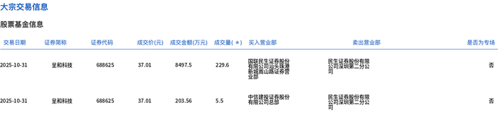 10月31日,呈和科技大宗交易成交235.1万股,成交额8701.06万元,占当日总成交额的66.72%,成交价37.01元,较市场收盘价37.27元折价0.7%。