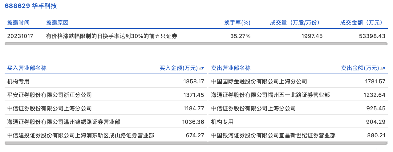 10月17日,华丰科技今日涨9.19%,全天换手率达36.48%,振幅达14.59%。龙虎榜数据显示,营业部席位合计净买入400.87万元。其中,机构买入1858.17万元,卖出904.29万元,合计净买入953.89万元。此外,平安证券浙江分公司、中信证券上海分公司分别买入1371.45万元、1184.77万元;中国国际金融上海分公司、海通证券福州五一北路证券营业部分别卖出1781.57万元、1232.64万元。