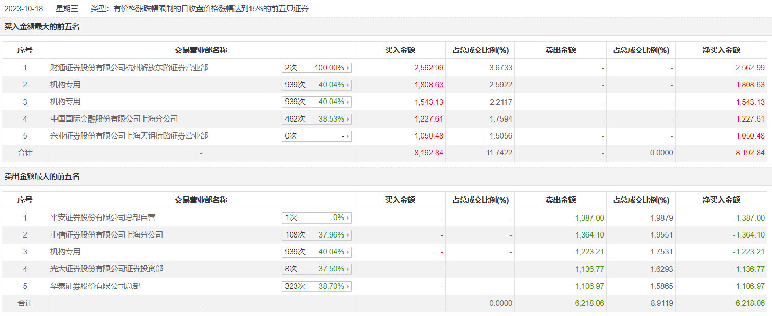 华丰科技10月18日涨停,全天换手率达43.2%,振幅达17.83%。龙虎榜数据显示,营业部席位合计净买入1974.77万元。其中,机构买入3351.76万元,卖出1223.21万元,合计净买入2128.54万元。此外,财通证券杭州解放东路证券营业部、中国国际金融上海分公司分别买入2562.99万元、1227.61万元;平安证券总部自营业部、中信证券上海分公司分别卖出1387.00万元、1364.10万元。