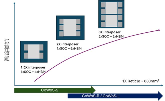 芯碁微装泛半导体销售总监潘昌隆指出,当前台积电主要使用的是CoWoS-S,随着大面积芯片设计越来越多,中介层越来越多,掩模尺寸越来越大,当中介层达到台积电最大reticle的四倍以上(1X reticle≈830mm),高于其当前中介层的3.3倍,就将转向CoWoS-L。
