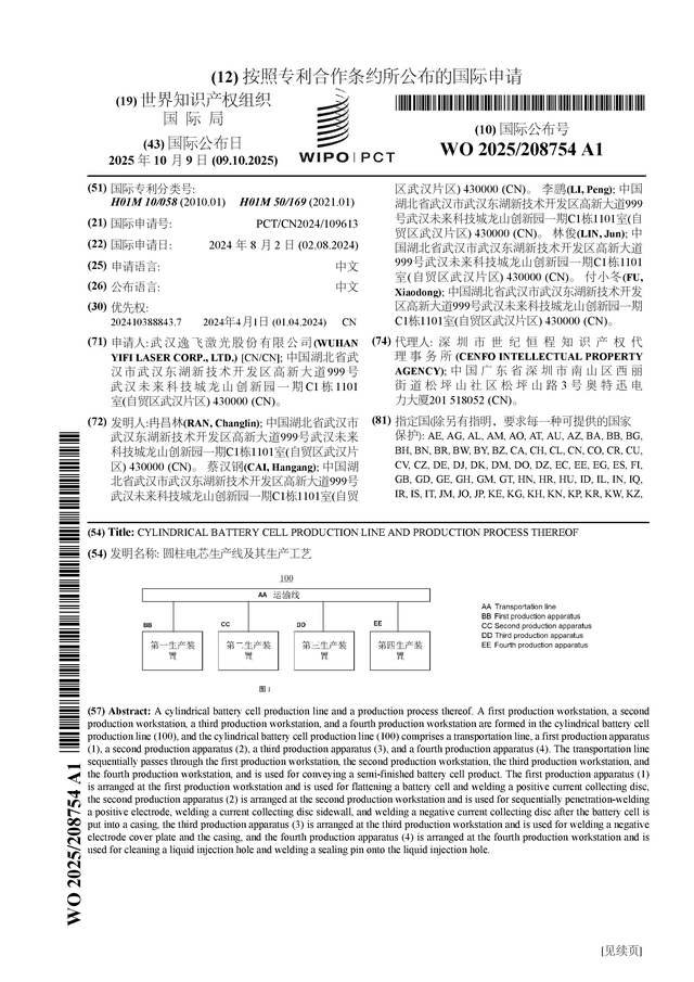 ST逸飞公布国际专利申请:“圆柱电芯生产线及其生产工艺”