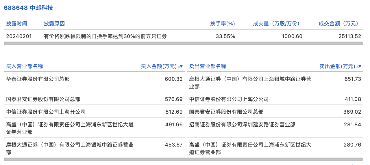2月1日,中邮科技今日跌14.82%,全天换手率达34.79%,振幅达11.83%。龙虎榜数据显示,营业部席位合计净买入640.59万元。其中,摩根大通上海银城中路证券营业部、中信证券上海分公司分别卖出651.73万元、411.08万元;华泰证券总部、国泰君安证券总部分别买入600.32万元、576.69万元。