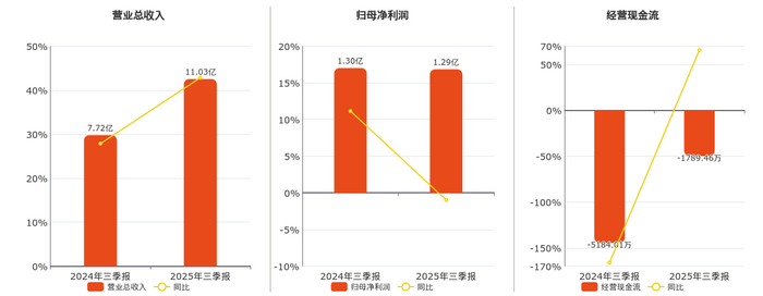公司营业总收入为11.03亿元,在已披露的同业公司中排名第53,较去年同报告期营业总收入增加3.31亿元,实现3年连续上涨,同比较去年同期上涨42.81%。归母净利润为1.29亿元,在已披露的同业公司中排名第52,较去年同报告期归母净利润减少128.22万元,同比较去年同期下降0.99%。经营活动现金净流入为-1789.46万元,在已披露的同业公司中排名第92,较去年同报告期经营活动现金净流入增加3394.55万元。