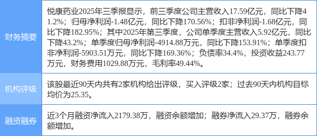2025年11月28日,开源证券研究员余汝意,巢舒然发布了对悦康药业的研报《公司信息更新报告:加大研发投入,创新管线逐步迈入收获期》,该研报对悦康药业给出“买入”评级。研报中预计2025-2027年归母净利润分别为-1.83/-0.53/0.69亿元(原预计为0.51/2.06/5.61亿元),EPS为-0.41/-0.12/0.15元,当前股价对应PE为-60.6/-208.5/161.2倍,我们看好公司创新布局及小核酸技术平台的长期成长潜力,维持“买入”评级。证券之星数据中心根据近三年发布的研报数据计算,该研报作者对此股的盈利预测准确度为15.42%。