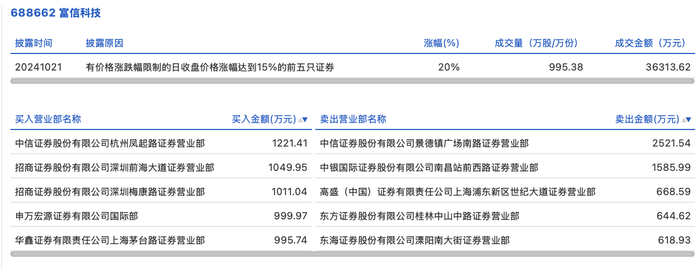 10月21日,富信科技今日涨停,龙虎榜数据显示,上榜营业部席位全天成交1.13亿元,占当日总成交金额比例为31.17%。其中,买入金额为5278.11万元,卖出金额为6039.67万元,合计净卖出761.55万元。