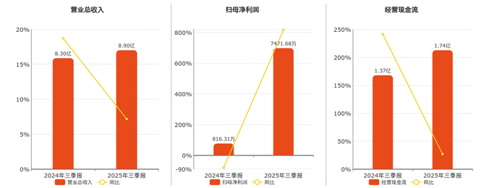 公司营业总收入为8.90亿元,在已披露的同业公司中排名第170。归母净利润为7471.68万元,在已披露的同业公司中排名第152。经营活动现金净流入为1.74亿元。