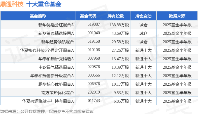 持有鼎通科技最多的基金为新华优选分红混合A,目前规模为9.68亿元,最新净值0.9438(10月21日),较上一交易日上涨4.83%,近一年上涨72.62%。该基金现任基金经理为赵强。