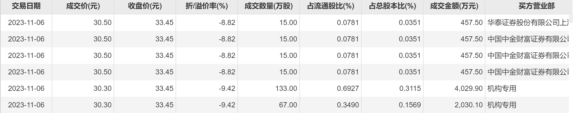 今日大宗交易成交260万股,成交额7890万元,占当日总成交额的49.48%,成交均价30.35元,较市场收盘价折价9.27%,其中最高成交价30.5元,最低成交价30.3元。