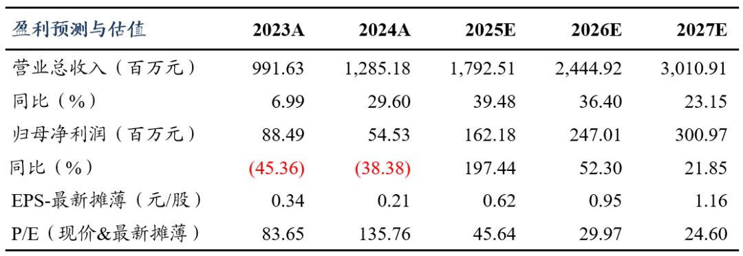 我们维持公司2025-2027年归母净利润预测分别为1.62/2.47/3.01亿元,当前股价对应动态PE分别为46/30/25倍,维持“增持”评级。