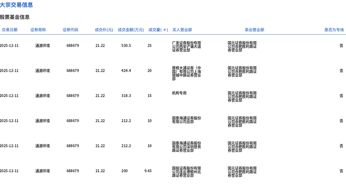 12月11日,通源环境大宗交易成交89.43万股,成交额1897.6万元,占当日总成交额的8.11%,成交价21.22元,较市场收盘价27.8元折价23.67%。
