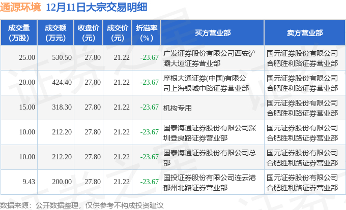 12月11日通源环境现6笔折价23.67%的大宗交易 合计成交1897.6万元
