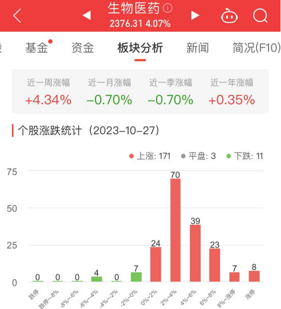 中国经济网北京10月27日讯今日,生物医药板块整体涨幅4.07%,其中171只股票上涨,3只股票平盘,11只股票下跌。