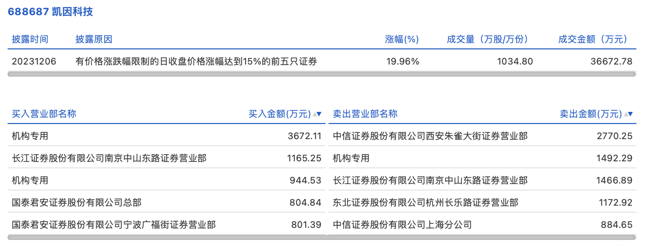12月6日,凯因科技今日涨19.96%,龙虎榜数据显示,上榜营业部席位全天成交1.52亿元,占当日总成交金额比例为41.38%。其中,买入金额为7388.12万元,卖出金额为7787.0万元,合计净卖出398.88万元。