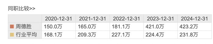 东方财富数据显示,2020年至2024年,周德胜薪酬分别为150万元、165万元、181.1万元、421万元、423.2万元,连续四年涨薪。