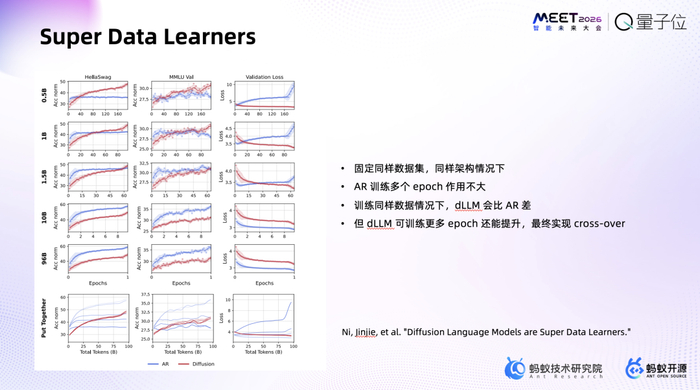所谓的“Super Data Learners”,如果了解图像或视频的扩散模型就会知道,它们有个特点——你可以一直训练。