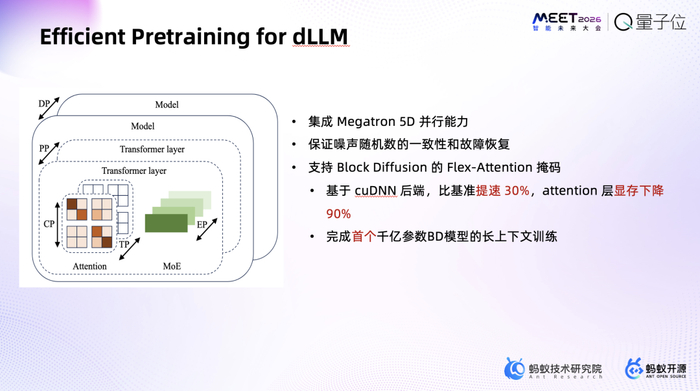 我们开源了一套训练框架和推理框架,让社区能把我们在Hugging Face上发布的模型直接跑起来。其中涉及5D并行集成、分区块Diffusion下的Flex-Attention与Attention Mask适配,细节不再展开。
