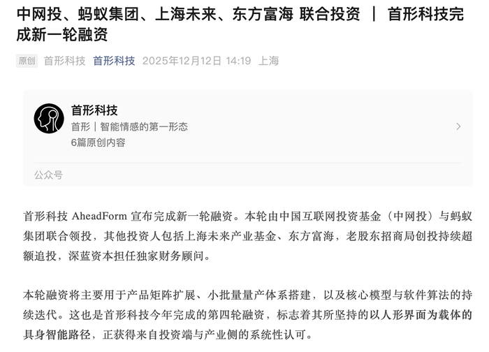 海归博士创立,首形科技完成新一轮融资、中网投与蚂蚁集团联合领投