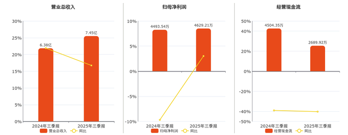 公司营业总收入为7.45亿元。归母净利润为4629.21万元。经营活动现金净流入为2689.92万元,较去年同报告期经营活动现金净流入减少1814.43万元,同比较去年同期下降40.28%。