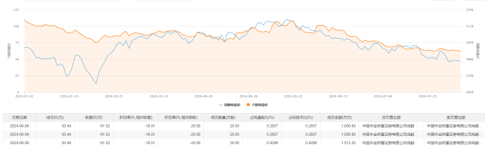 8月9日大宗交易成交70万股,成交额3530.8万元,占当日总成交额的50.75%,成交价50.44元,较市场收盘价61.52元折价18.01%。