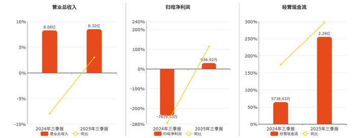 公司营业总收入为8.32亿元,较去年同报告期营业总收入增加2408.54万元,同比较去年同期上涨2.98%。归母净利润为936.92万元,较去年同报告期归母净利润增加8556.45万元。经营活动现金净流入为2.28亿元,在已披露的同业公司中排名第42,较去年同报告期经营活动现金净流入增加1.70亿元,实现2年连续上涨,同比较去年同期上涨296.70%。