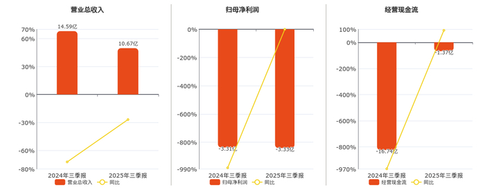 公司营业总收入为10.67亿元,较去年同报告期营业总收入减少3.93亿元,同比较去年同期下降26.90%。归母净利润为-3.33亿元,较去年同报告期归母净利润减少160.64万元。经营活动现金净流入为-1.37亿元,较去年同报告期经营活动现金净流入增加15.37亿元。