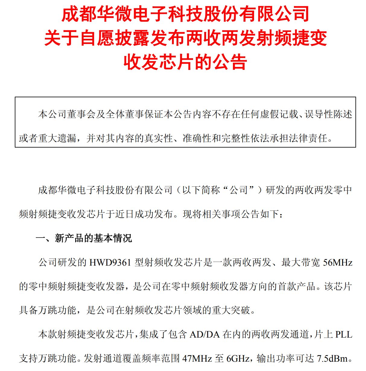 成都华微在公告中表示,本次公司推出的HWD9361型两收两发射频捷变收发芯片尚处于市场导入初期,暂未实现规模化销售,存在市场需求不确定、客户验证失败等风险。公司尚无法预测新产品对公司当前及未来经营业绩的影响。