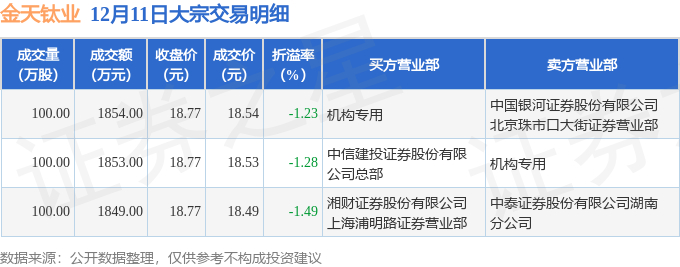 12月11日金天钛业现3笔大宗交易 机构净买入1万元