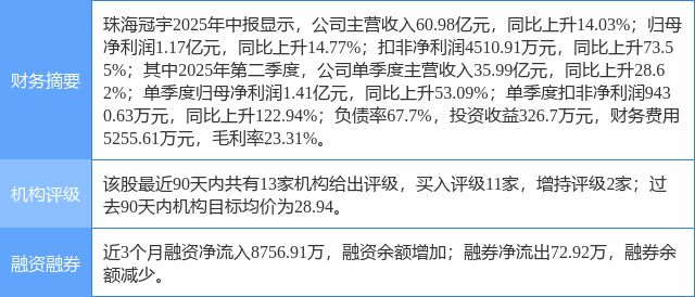 2025年8月26日,东吴证券研究员曾朵红,阮巧燕,朱家佟发布了对珠海冠宇的研报《2025年中报点评:手机出货高增业绩符合预期,折旧年限调整增厚后续利润》,该研报对珠海冠宇给出“买入”评级,认为其目标价为27.0元,现价距离目标价尚有8.39%的涨幅空间。证券之星数据中心根据近三年发布的研报数据计算,该研报作者对此股的盈利预测准确度为85.06%。