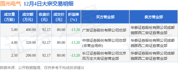 12月4日国光电气现3笔折价13.2%的大宗交易 合计成交920万元