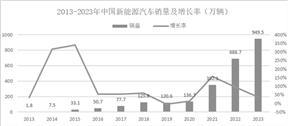 2013-2023年新能源汽车销量及增长率(数据来源:中国汽车工业协会)