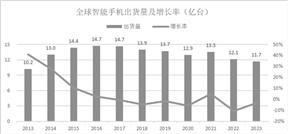 2013-2023年智能手机出货量及增速(数据来源:IDC)
