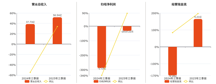 公司营业总收入为50.54亿元,较去年同报告期营业总收入增加12.81亿元,同比较去年同期上涨33.96%。归母净利润为-2010.22万元,较去年同报告期归母净利润增加1.52亿元。经营活动现金净流入为4.21亿元,较去年同报告期经营活动现金净流入增加8.55亿元,实现2年连续上涨。