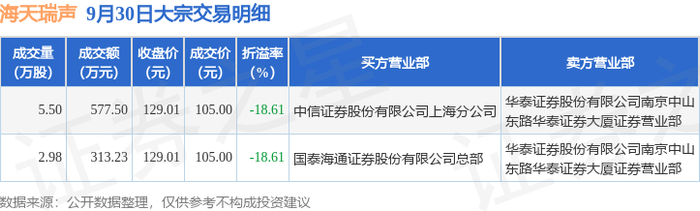 证券之星消息,9月30日海天瑞声发生大宗交易,交易数据如下: