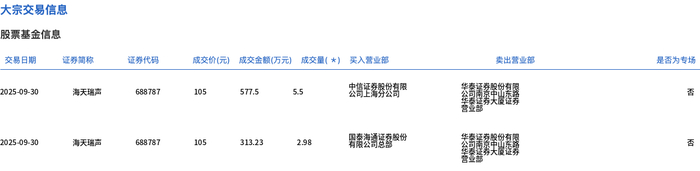 9月30日,海天瑞声大宗交易成交8.48万股,成交额890.73万元,占当日总成交额的1.3%,成交价105元,较市场收盘价129.01元折价18.61%。