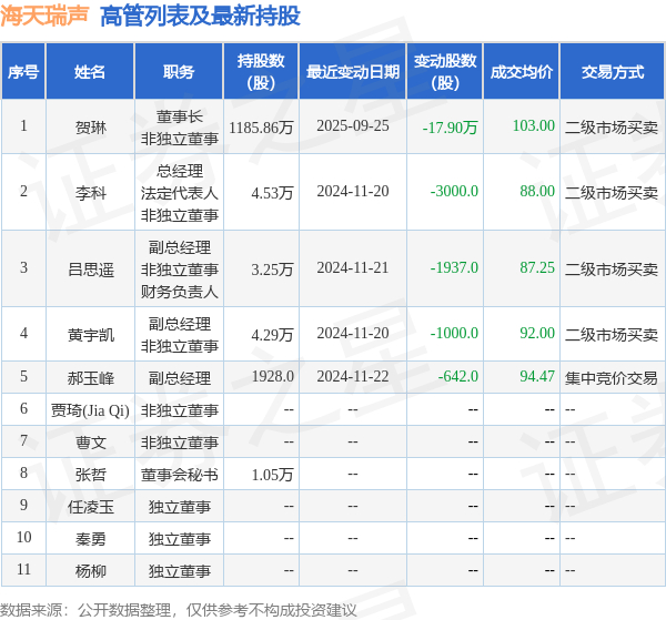 海天瑞声近半年内的董监高及核心技术人员增减持详情如下: