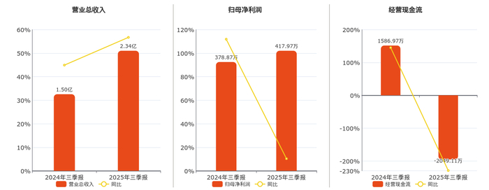 公司营业总收入为2.34亿元,在已披露的同业公司中排名第98。归母净利润为417.97万元,在已披露的同业公司中排名第68。经营活动现金净流入为-2049.11万元,较去年同报告期经营活动现金净流入减少3636.07万元,同比较去年同期下降229.12%。