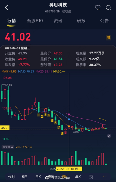 而在2022年6月9日,科思科技进行了分红和增发,后复权的当季股价在49-78之间,跑得慢了基本上都亏了。