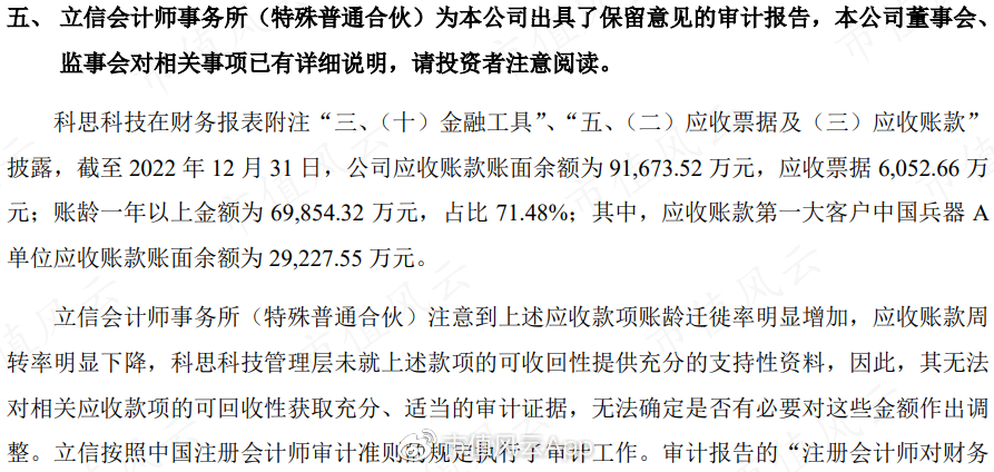 不仅如此,立信在审计科思科技的年报时,出具了带保留意见的审计报告,主要涉及应收账款的可回收性。年报中,公司已经计提了近1.9亿的应收账款坏账准备。