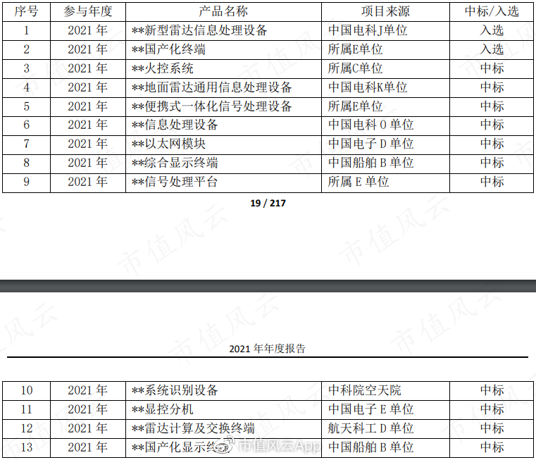 到了上市后的2021年,新中标/入选的项目数量大幅增加,共13个。根据字面意思推测,其中属于雷达信息处理设备的有4个,属于指控信息处理设备的有2个,1个属于其他信息处理终端,另外还有3个终端类产品,剩余3个用途不明。