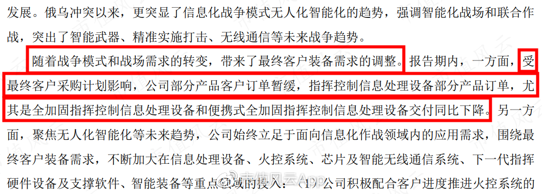 公司当时表示,造成这一突然变化的原因是“战场模式及战场需求的转变,以及最终客户装备需求的调整”。结合当时的时点,这应该与俄乌战争有关,毕竟,战争时期军方对装备需求的变化是很常见的。