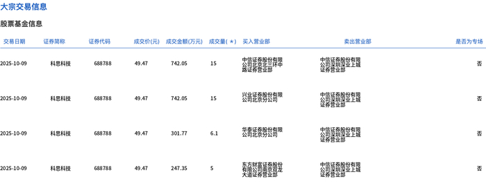 10月9日,科思科技大宗交易成交41.1万股,成交额2033.22万元,占当日总成交额的7.69%,成交价49.47元,较市场收盘价56.26元折价12.07%。