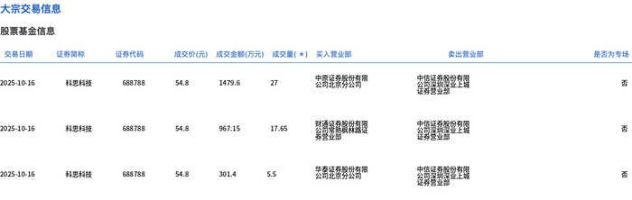 10月16日,科思科技大宗交易成交50.15万股,成交额2748.15万元,占当日总成交额的6.92%,成交价54.8元,较市场收盘价64.36元折价14.85%。
