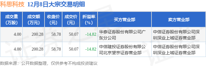 12月8日科思科技现2笔折价14.82%的大宗交易 合计成交400.56万元