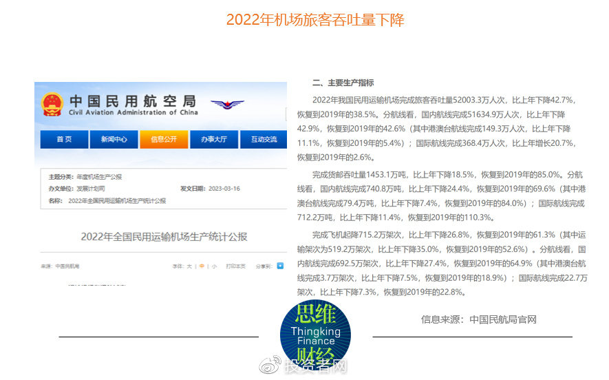 根据中国民航局发布的《2022年全国民用运输机场生产统计公报》,2022年中国民用运输机场完成旅客吞吐量52003.29万人次,同比上年下降42.7%,货邮吞吐量为1453.05万吨,比上年下降18.5%,起降架次715.19万架次,比上年下降26.8%(见下图)。